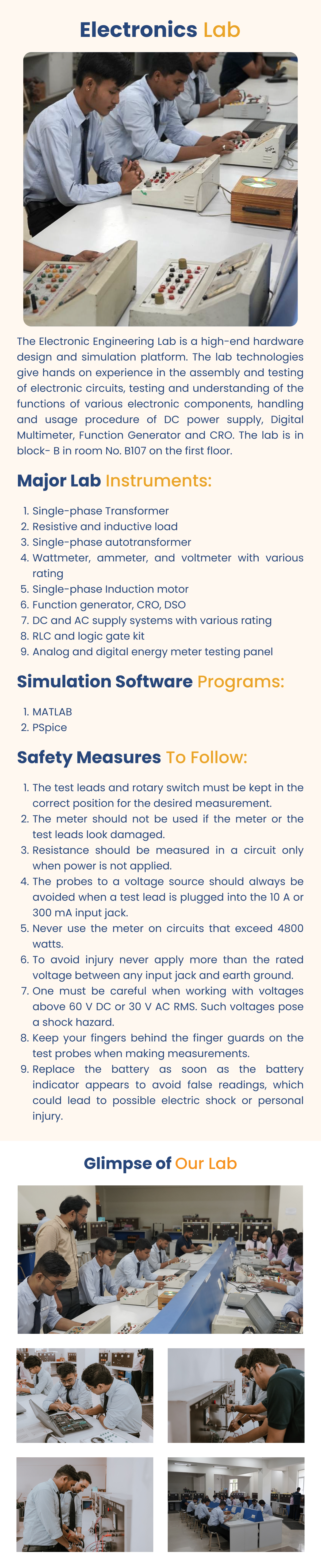 The Electronic Engineering Lab is a high-end hardware design and simulation platform. The lab technologies give hands on experience in the assembly and testing of electronic circuits, testing and understanding of the functions of various electronic components, handling and usage procedure of DC power supply, Digital Multimeter, Function Generator and CRO. The lab is in block- B in room No. B107 on the first floor.